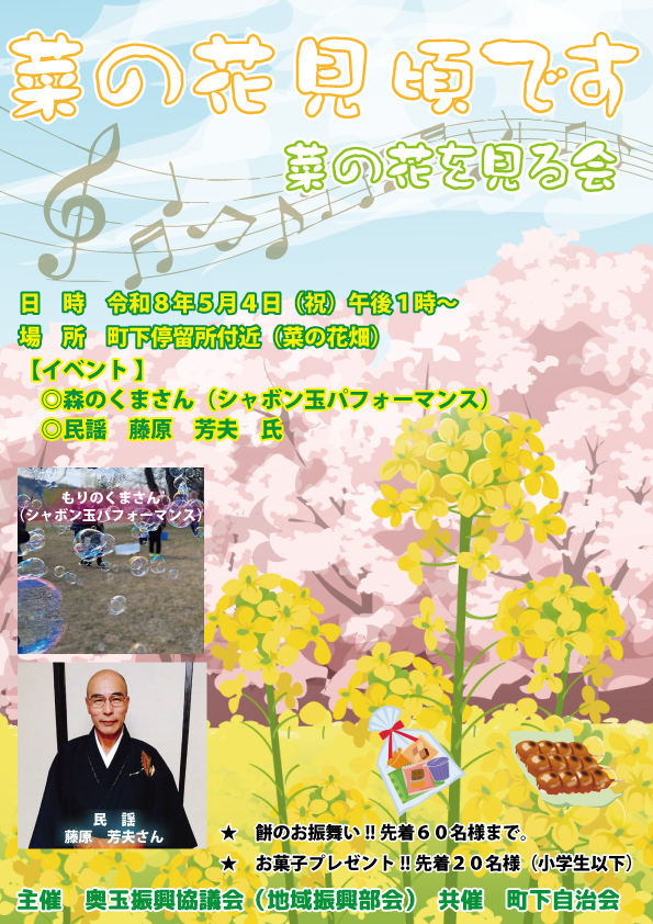 令和8年5月4日(月/祝)午後1時~ 主催:奥玉振興協議会地域振興部会と町下自治会共催による「菜の花見頃です♪」を開催します。場所は、町下停留所付近の菜の花畑です。先着60名に振る舞い餅!!また、小学生以下先着20名にお菓子のプレゼントもあります。その他にお団子やビール、ノンアル飲料等などの販売。そして、森のくまさんによるシャボン玉パフォーマンス!元猊鼻渓船頭の藤原芳夫氏による民謡など、春を先取る楽しいイベントとなっております。是非、お子様も一緒にお出かけ下さい。