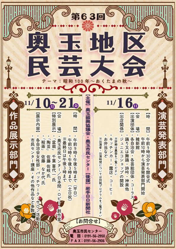 11月16日(日)午前9時30分開会式。8自治会からダンス、合唱、スコップ三味線の他、詩吟、コーラス、民族芸能「伊勢神楽」「打ちばやし」「奥玉神楽」など多数の演目。特別出演は「一関 時の太鼓顕彰会」による太鼓演奏。「あらたま作品展」も同時開催!出店コーナーでは、キッチンカーやまっちゃん工房、小学6年生児童によるチャレンジショップなど。是非、足をお運びください♪